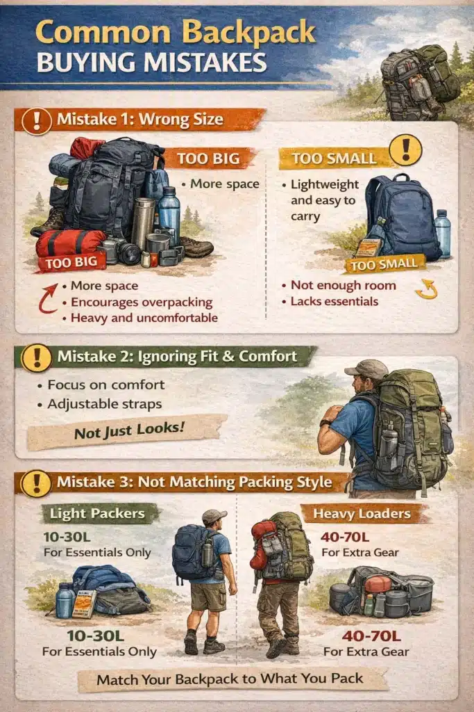 Picking the right backpack is key to comfort and efficiency on hikes. Many people make mistakes when choosing a backpack. These errors can hurt their comfort, performance, and hiking experience. In this section, we will highlight some of the most frequent mistakes to avoid when buying a backpack.